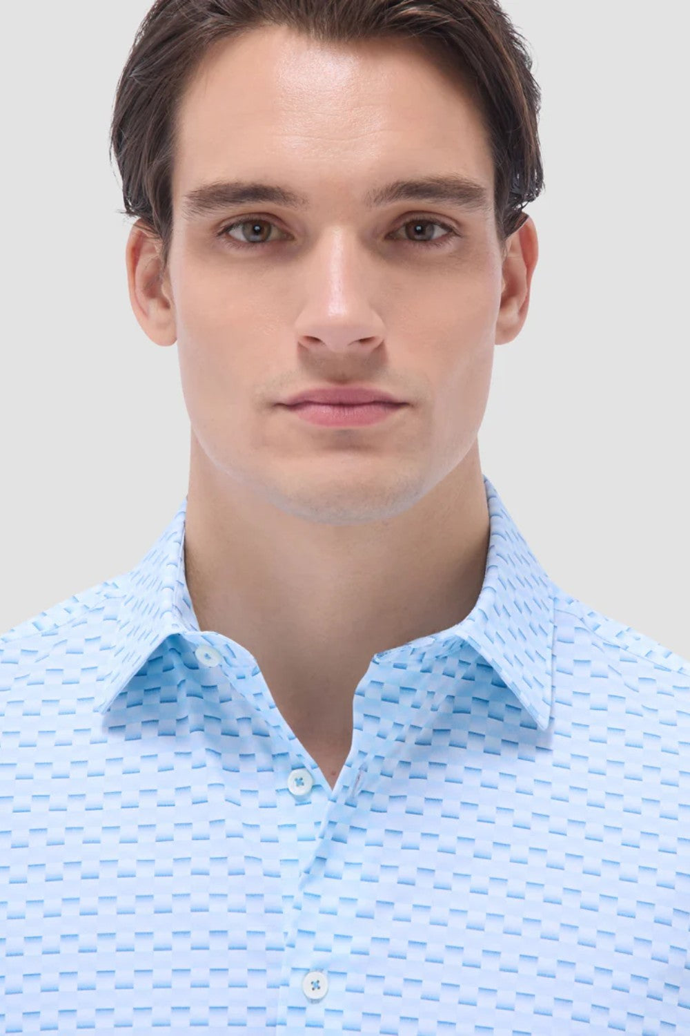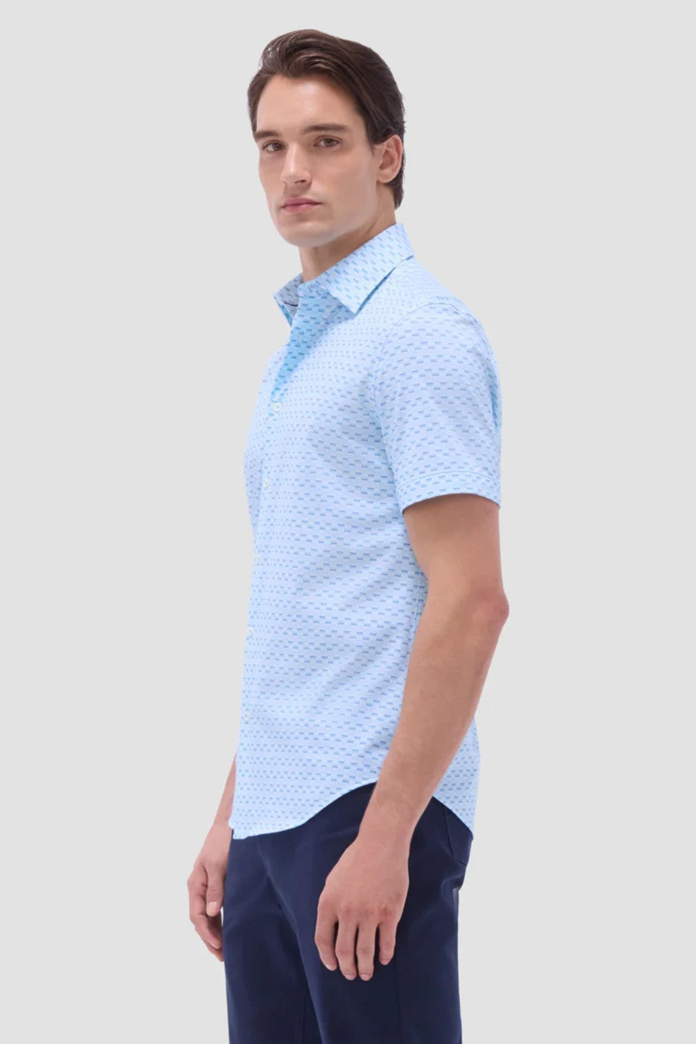 The Miles OoohCotton short-sleeve shirt in basketweave print features a point collar, mother-of-pearl buttons, and a curved hem for a sleek tucked or untucked look. OoohCotton is a performance, double-mercerized, wrinkle-resistant, breathable, and easy-care cotton blend with 8-way stretch, quick-dry, and thermal comfort properties.