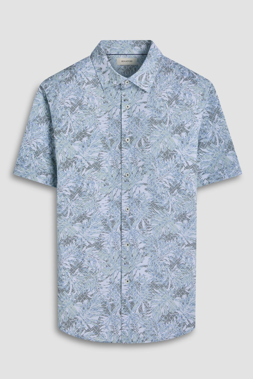 The Miles short-sleeved shirt features a chambray effect print on OoohCotton fabric, a point collar, genuine shell buttons, and a curved hem. OoohCotton is a double-mercerized, wrinkle-resistant, breathable, and easy-care cotton blend with 8-way stretch, quick-dry, and thermal comfort properties.