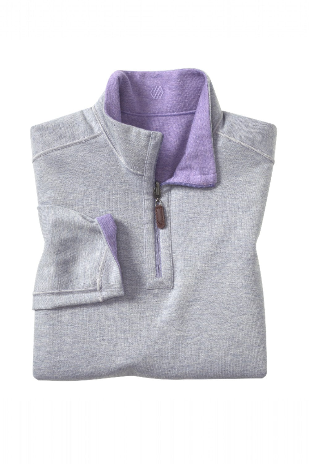 •Quarter zip placket with logo leather-look pull.