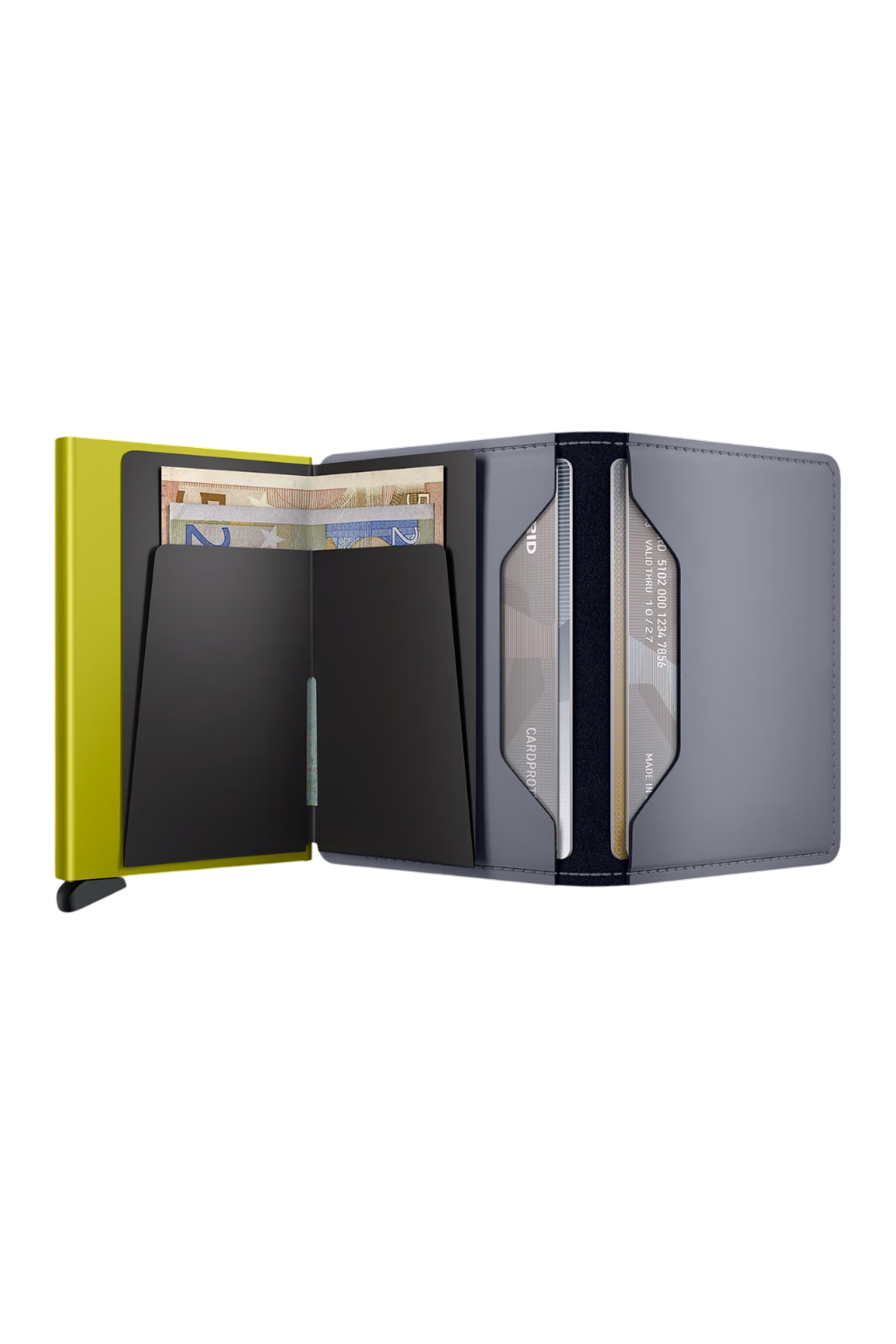 Its slim profile allows the Slimwallet to fit perfectly into any pocket. The open exterior is designed extra wide to accommodate cards, banknotes and receipts. The Cardprotector mechanism enables you to slide out cards with a simple motion, while the aluminium construction protects your cards from bending, breaking and unwanted wireless communication.