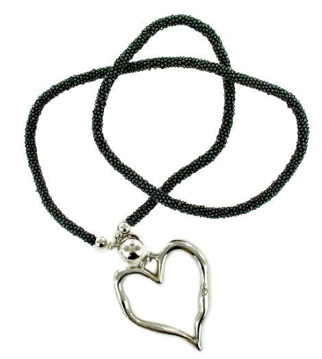A sophisticated beaded rope necklace, finished off with an open metal heart. Easy to wear with any outfit.