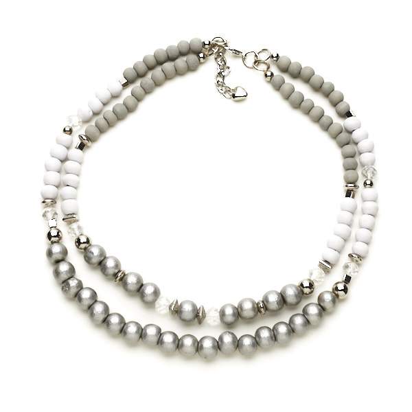 This double strand wooden necklace looks great in these natural tones. It falls at the collarbone, and closes with a lobster clasp.