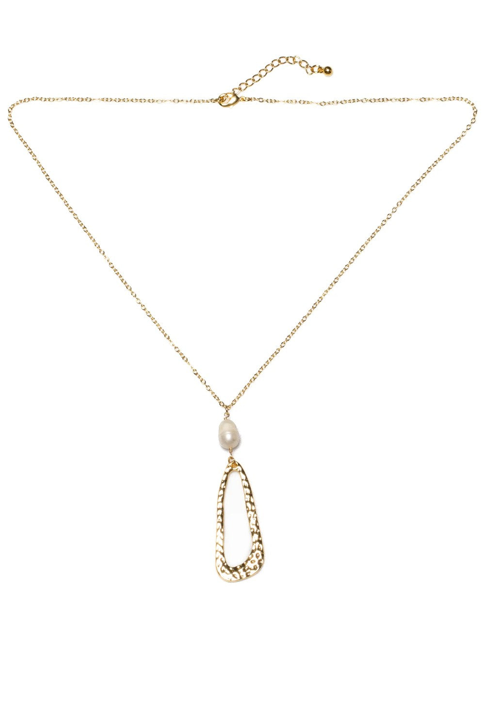This elegant and contemporary hammered oval pendant in gold plate features a beautiful pearl, adding a touch of sophistication to any outfit. Embrace a timeless and refined look with this stunning piece.