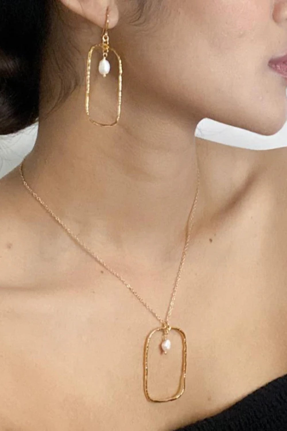 This elegant and contemporary hammered rectangle pendant in gold plate features a beautiful pearl, adding a touch of sophistication to any outfit. Embrace a timeless and refined look with this stunning piece.