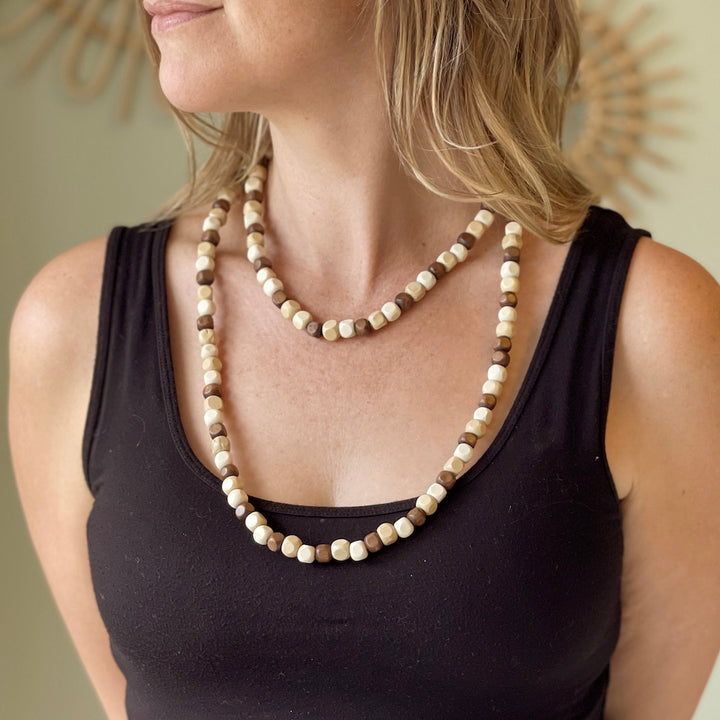 This long simple necklace is made from wooden beads that give you a beautiful natural look. It has no clasp and slips over the head.
